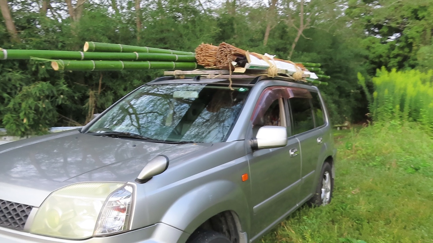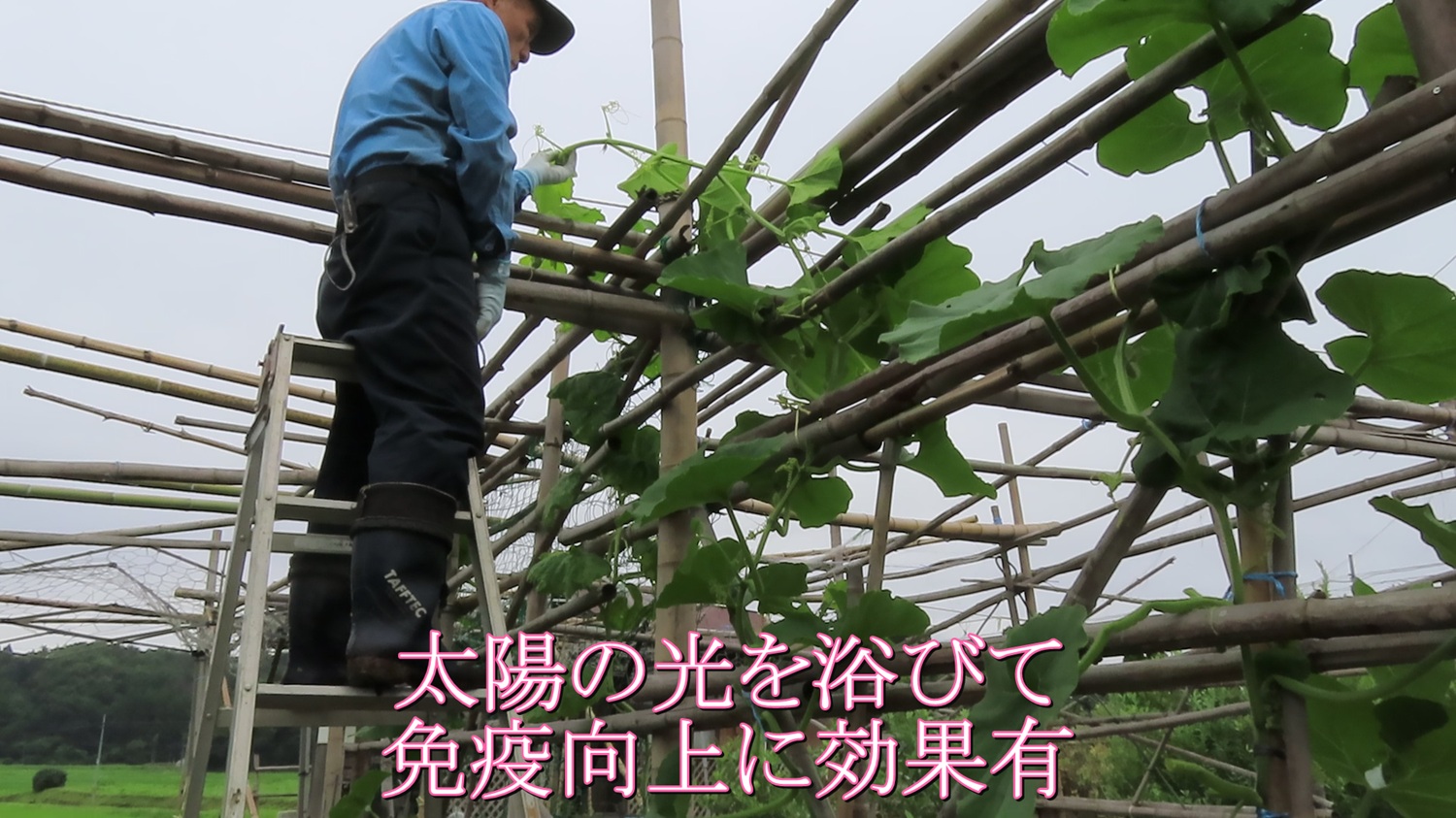 みちのく郡山も、一段と寒さが増しで降雪期になりました。竹切は冬場に限られています。それは揚水期(水分の吸い上げ)では無いので、竹を切っても維持能力が高くなるのです。今回は、昨年強風で倒壊した真竹カボチャ棚を補強します。昨年、孟宗竹で35本の縦柱を設営。今年は、上部に孟宗竹を横に張り付けして補強。仮止めしてある古い真竹は排除します。