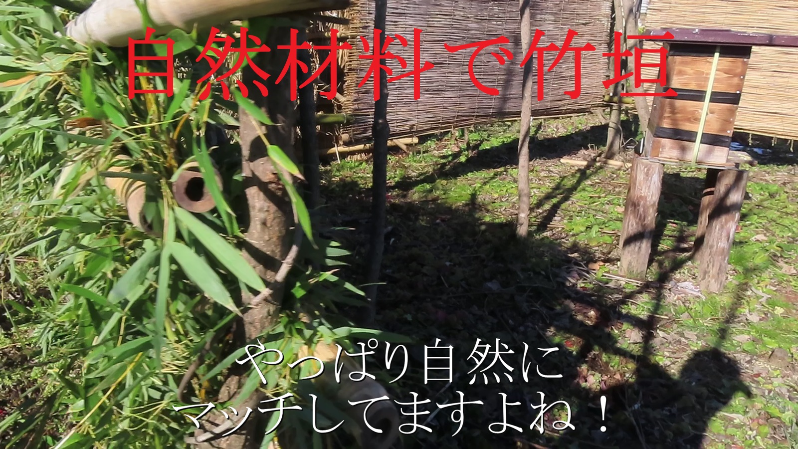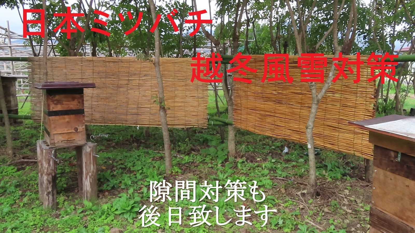 孟宗竹笹小枝で暴風避け竹垣  日本ミツバチ寒さ対策