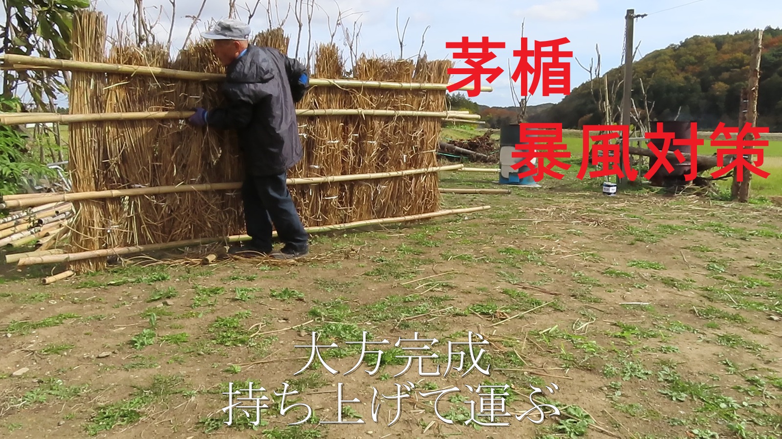 みちのく郡山も、晩秋と共に西からの強風が吹き晒します。奥羽山麓を越えて、諏訪峠の旧坂を巻き上げるのです。数年前には、農場直ぐ近くに県警ヘリがダウンバーストで墜落。初めて冬を迎える分蜂ミツバチ。何とか守りたいと、茅屋根修復で余った茅を利用して、暴風楯を作成しました。